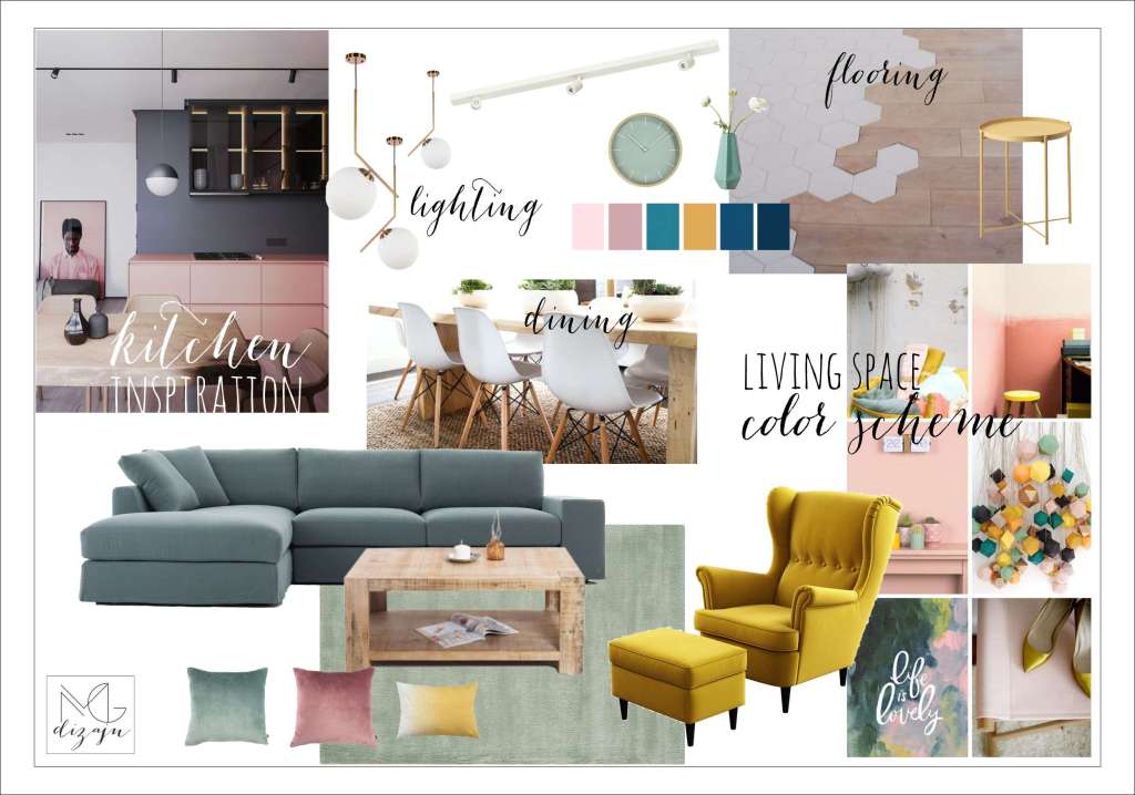 Moodboard i 3d vizuelizacija dnevne sobe sa trpezarijom i kuhinjom